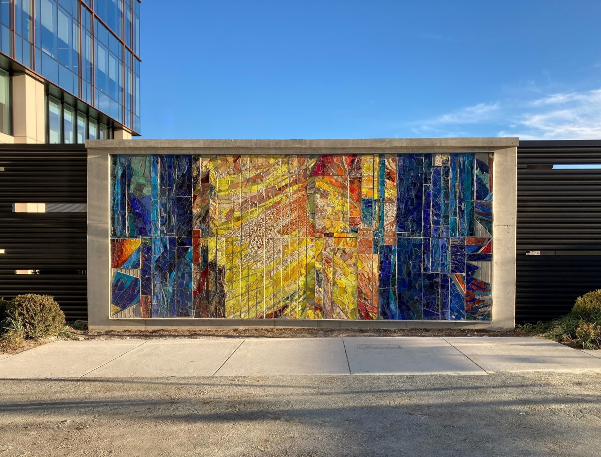 As part of the demolition of the clocktower and the parking garage in 2022, large slab sections of the mosaic on the parking garage were retrieved and reconfigured to create this new, vibrant installation in the public plaza adjacent to the Metro Building at New Carrollton.