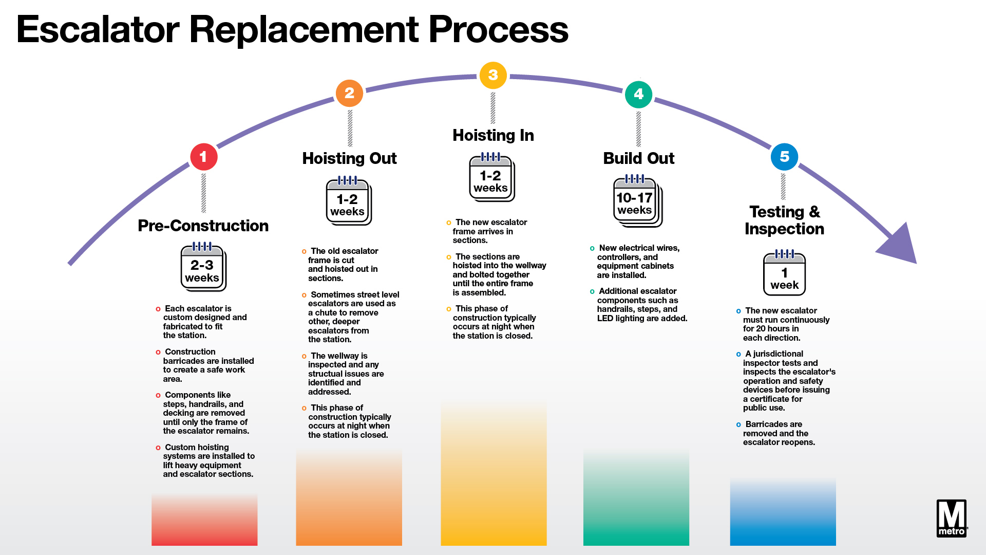 Several Metro stations have active escalator replacement projects. Pay attention to posted signage at your station. We will notify you ahead of every long-term escalator closure.