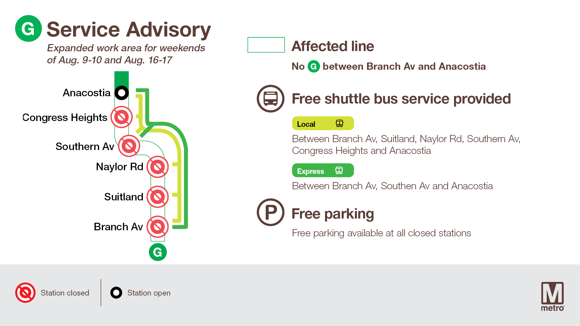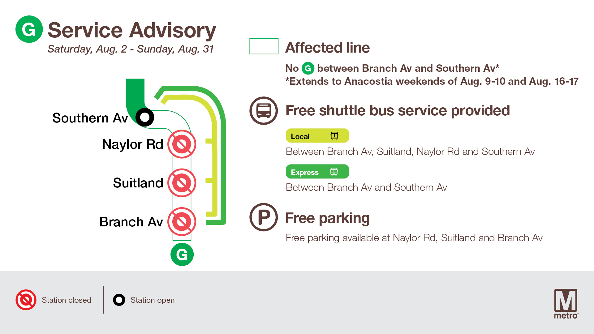 During Phase 2, Branch Ave, Suitland, and Naylor Road stations will close on the Green Line between Aug. 2 and Aug. 31. Additionally, for two weekends, Aug. 9 and 10 and Aug. 16 and 17, Congress Heights and Southern Avenue will close. Metro chose a four-week construction schedule to avoid seven months of consecutive weekend closures. The work is also being completed during months when ridership is typically lower.